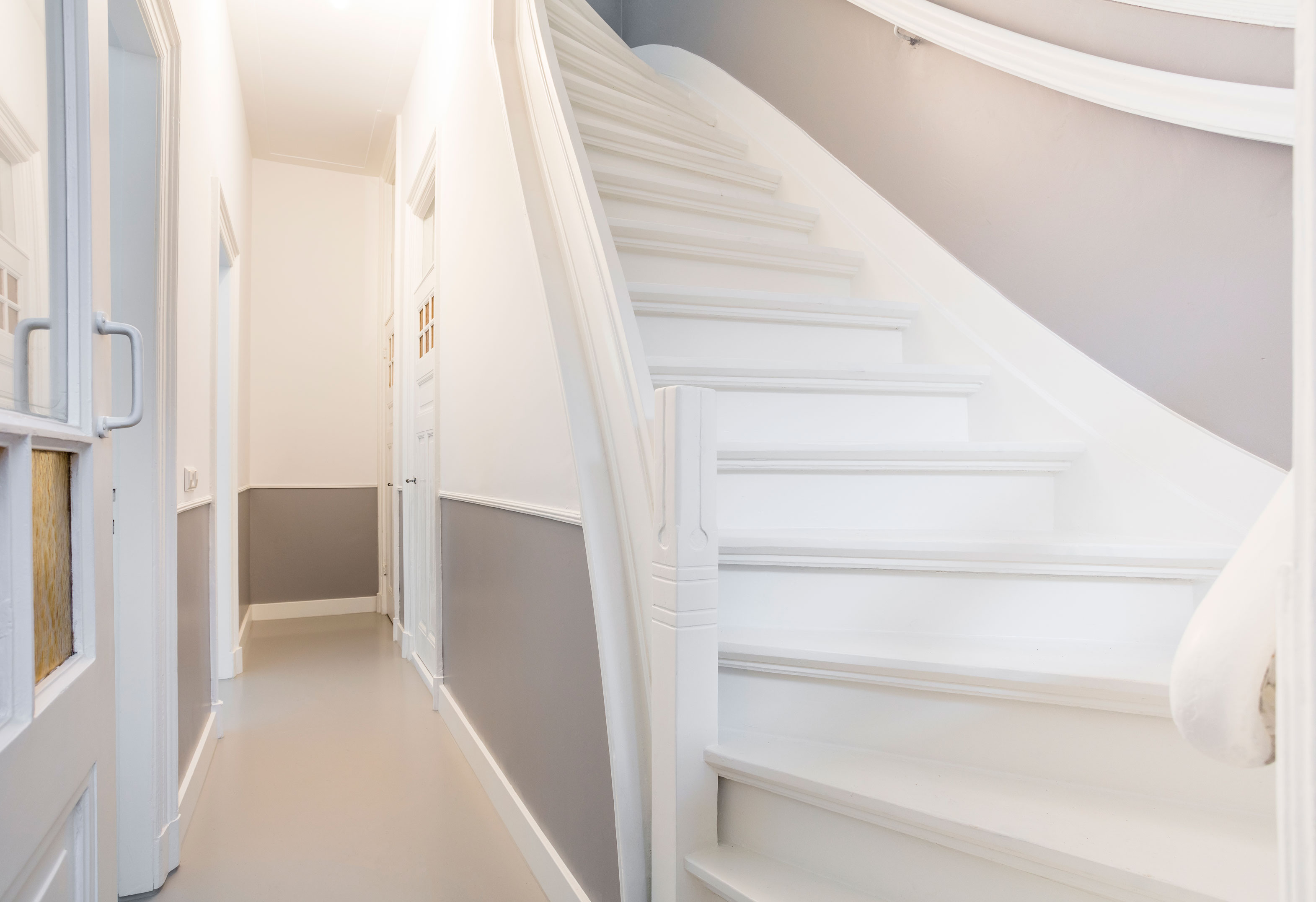 Voor deze klus hebben we verschillend soorten verven gebruikt. Op het houtwerk hebben we de beste kwaliteit hoogglans gebruikt. Voor de muren hebben we gebruik gemaakt van supermatte verf. We gebruiken alleen topproducten. De vuistregel hierbij is: hoe duurder, hoe beter de kwaliteit maar hoe moeilijker te schilderen. In dure latexverf zit namelijk veel latex, in goedkope latex zit veel kalk. Daardoor zijn er bij de duurdere latexverf meer lagen nodig om het dekkend te maken.